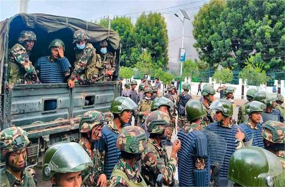 नेपाली सेना ने विरोध प्रदर्शन की आड़ में किसी भी संभावित हिंसा को रोकने के लिए बुधवार को सुबह से शाम पांच बजे तक देशव्यापी प्रतिबंधात्मक आदेश लागू कर दिए और अगले दिन सुबह छह बजे तक कर्फ्यू लगा दिया है। सेना ने एक बयान में चेतावनी दी कि इस अवधि के दौरान किसी भी प्रकार के प्रदर्शन, तोड़फोड़, आगजनी व व्यक्तियों या संपत्ति को निशाना बनाने वाले हमलों को आपराधिक गतिविधि माना जाएगा और उससे निपटा जाएगा। इसमें कहा गया है कि प्रतिबंधात्मक आदेश पूरे देश में सुबह से शाम पांच बजे तक प्रभावी रहेंगे और उसके बाद बृहस्पतिवार सुबह छह बजे तक कर्फ्यू लागू रहेगा।