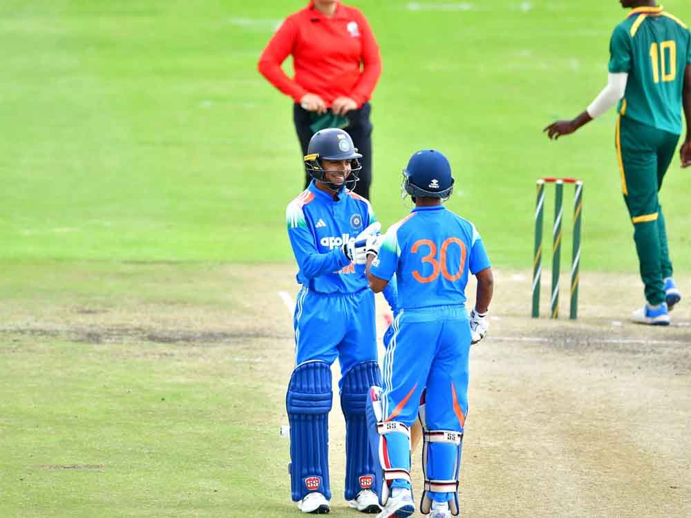यूथ ओडीआई सीरीज में भारत और दक्षिण अफ्रीका के बीच तीसरा मुकाबला बुधवार को बेनोनी में खेला जा रहा है। भारत ने तीसरे मुकाबले में पहले बल्लेबाजी करते हुए अच्छी शुरुआत की है। भारत को वैभव सूर्यवंशी के रूप में पहला झटका लगा। वैभव 74 गेंद में 127 रन बनाकर आउट हुए। उन्होंने अपनी पारी में 9 चौके और 10 छक्के लगाए। वैभव और आरोन के बीच पहले विकेट के लिए 154 गेंद में 227 रन की साझेदारी हुई। आरोन जॉर्ज 106 गेंद में 118 रन बनाकर आउट हुए। वेदांत 43 गेंद में 34 रन बनाकर आउट हुए। हरवंश रन आउट हुए। अभिज्ञान कुंडू ने 20 गेंद में 21 रन बनाए। कनिष्क 10 और एम्ब्रिश 8 रन बनाकर आउट हुए।