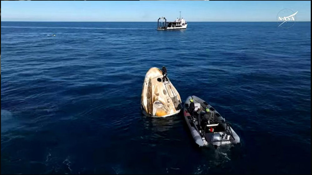 14 जनवरी को शाम को ड्रैगन यान ISS से अलग हुआ. रात में डी-ऑर्बिट बर्न (धीमा होने की प्रक्रिया) पूरी हुई. पैराशूट की मदद से यान समुद्र में उतरा. रिकवरी शिप और तेज नावों की टीम ने यान को सुरक्षित किया और मुख्य डेक पर लाया. एस्ट्रोनॉट्स यान से बाहर निकले.